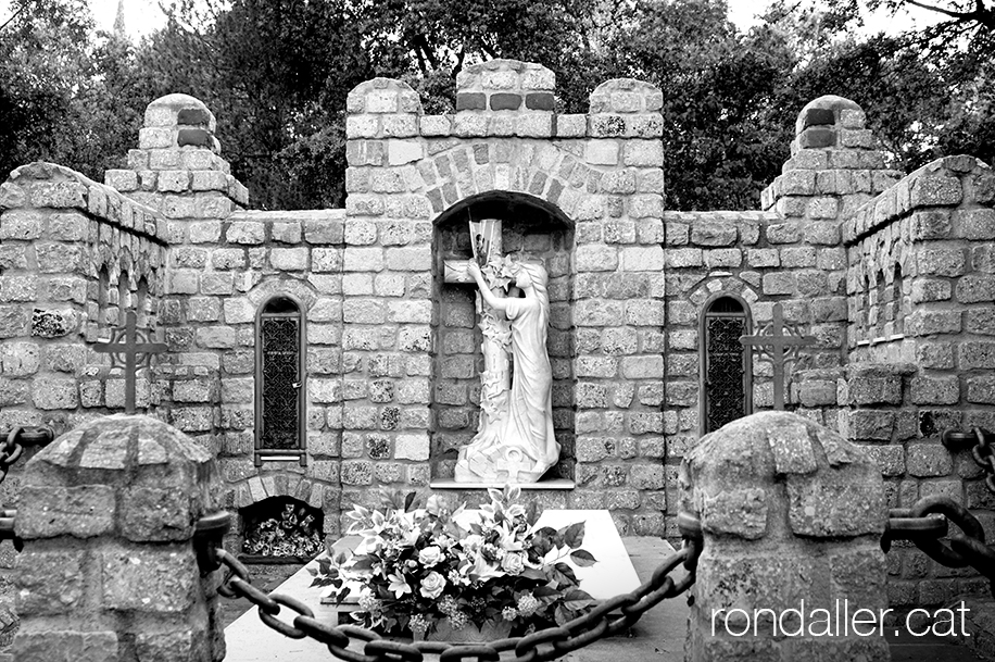 Per no deixar res a l’atzar, l’autor també projectà la seva residència pel més enllà. Al cementiri de Terrassa edificà un panteó seguint l’estil del seu estimat castell de les Fonts. Està envoltat per un mur fet de llambordes que inclou merlets, petites torres, finestres i bancs adossats. El conjunt inclou una fornícula amb l’escultura de marbre d’una noia abraçada a una creu per on s’enfila l’heura. El desembre de 2024 Jacint García passava a ocupar el que ara és el seu castell etern.