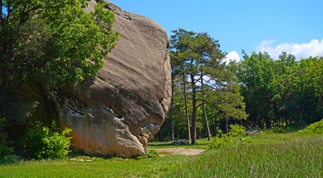 Primer veureu El Dau, un gran roc on s’hi van trobar restes prehistòriques i que ara l’utilitzen per fer escalada.